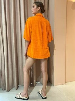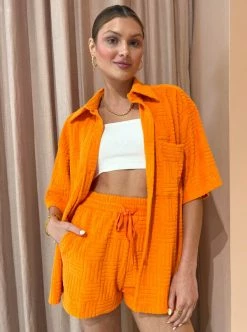 Bring some extra sunshine to the beach this season with the Bobby S/S Shirt in Nectar by Aston Studio. Crafted from a premium soft terry, this shirt features a short-sleeve relaxed silhouette with a detailed stripe pattern. Coveted for the sun-kissed hue, pair this shirt over a bikini for a post swim dip or with the matching Harvey Short for an elevated beach to bar ensemble. DETAILS & CARE Fabric: 80% Cotton 20% Polyester- Relaxed sillhouette – Short sleeve – Detailed stripe pattern- Premium soft terry. Care Instructions: Wash with similar colours. Machine wash, cold gentle cycle. Our Coco girl Ella Grace wears a size AU 6 / XS. | Oversize fit, recommend sizing down.Ella Grace's height is 176cm. Our Coco Girl Eden wears a size AU 6 / XS. | Oversize fit, recommend sizing down.Eden's height is 175cm. COCO STYLING TIP Complete the look with the Aston Studio Harvey Short in Nectar, Alohas Slip on Cross Sandal in Ivory, Amber Sceats Grande Helena Ring in Gold, Arms of Eve Eros Textured Ring in Gold, Amber Sceats Bella Earrings in Gold, Porter Baby Link Bracelet in Gold, and the Porter Chunky Belcher Necklace 2.0 in Gold.