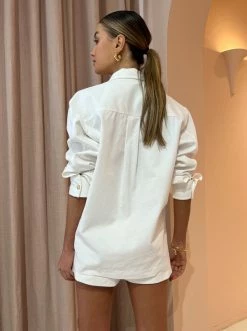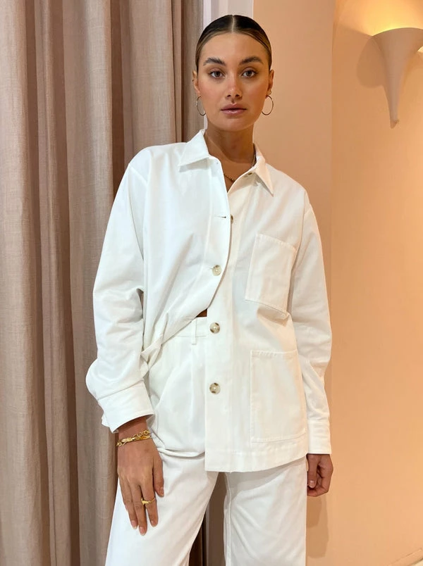Refresh your wardrobe basics with the Bec + Bridge Pamela Shirt in Ivory. Crafted from Cotton in Ivory, this oversized boxy shirt sits relaxed on the body. Featuring long sleeves, a collar, patch pockets, topstitching detail and contrast buttoned placket and cuffs. Styled with the matching Pamela Short in Ivory or over swim, the Pamela Shirt is a timeless investment for year round styling. DETAILS & CARE Fabric: 100% Cotton – Relaxed oversized fit – Tailored shirt – Long sleeves – Collared – Patch pockets – Topstitch detailing – Contrast buttons on placket and cuffs – Top stitch fold back hem Care instructions: Cold hand wash separately. Do not soak or bleach. Gentle spin to remove excess water, do not tumble dry. Hang to dry in shade. Cool iron with a pressing cloth. Dry cleanable. Our Coco girl Eden wears a size 8 AU / small. Eden's Height is 175cm. COCO STYLING TIP Complete with the Bec + Bridge Pamela Shorts in Ivory for a complete set look and accessorise with the Alias Mae Parlo Slide in Cream, Reliquia Trending Upwards Hoops in Gold, Amber Sceats Hudson Bracelet in Gold, Amber Sceats Coco Bracelet in Gold and Porter Bolt Ring Necklace in Gold.
