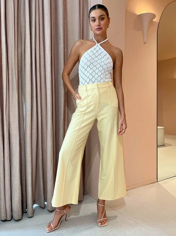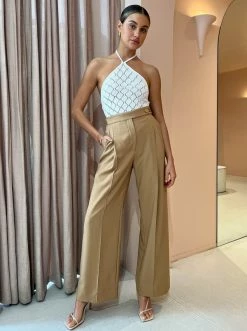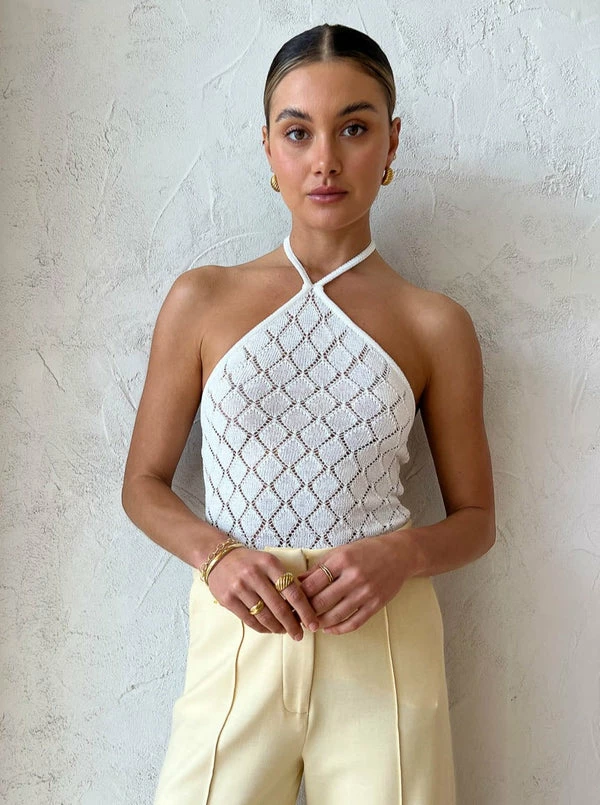 The Sienna Knit Halter Top in Ivory from Bec + Bridge will add a touch of Slim Aarons inspired glamour to your Spring Summer wardrobe. Delicately crafted from a Cotton blend, this halter top makes a statement with its unique cutwork and detailing. Sitting cropped it features a thin halter neckline and low square backline. Styled with a tailored pant or floaty skirt, the Sienna Knit Halter is a timeless staple designed for on repeat wear. DETAILS & CARE Fabric: 58% Cotton, 42% Nylon – Halter top – Cropped – Low back – Knit Care instructions: Our Coco girl Eden wears a size 8 AU / small. Eden's Height is 175cm. COCO STYLING TIP For a sweet 70's look complete with the Anna Quan Albert Pants in Butter or go for a tonal moment with the Clea Billie Pleat Trouser in Biscuit. Accessorise with the Alias Mae Molly Heel in Cream, Porter Croissant Earrings in Gold, Amber Sceats Coco Bracelet in Gold and the Porter Heirloom Bangle in Gold.