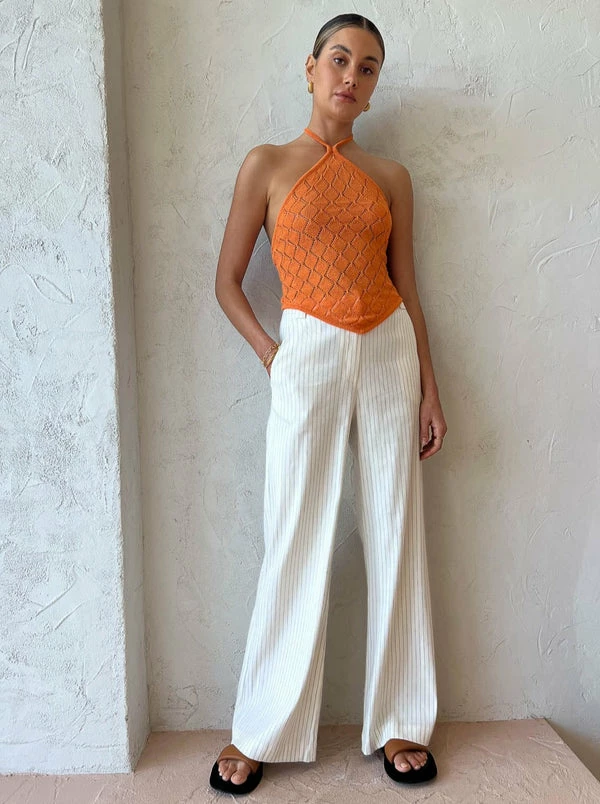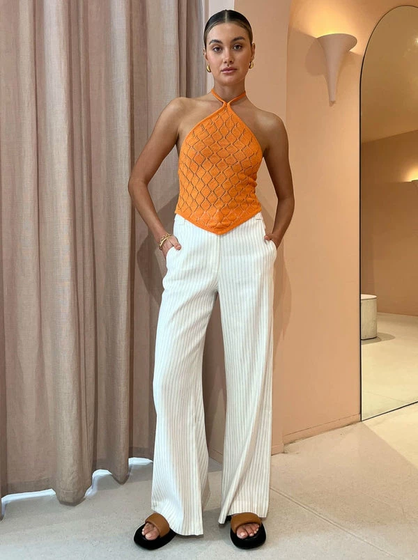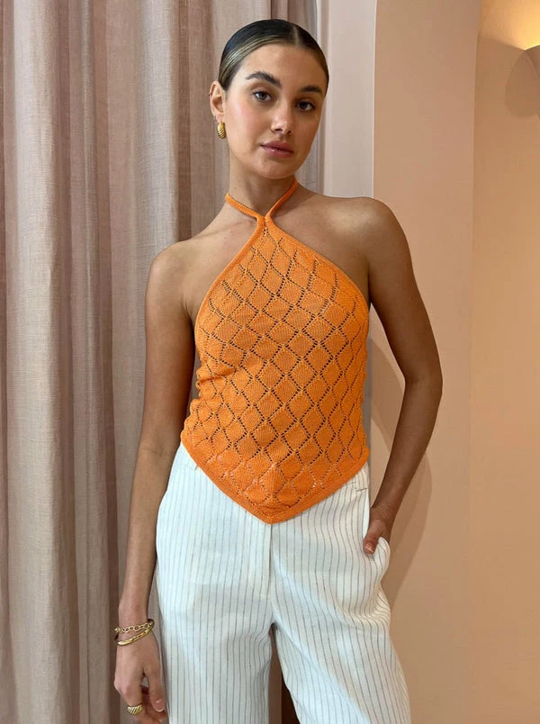 Bec + Bridge fuses retro knitwear with bold hues in the Sienna Knit Halter Top in Nectarine Orange. Delicately crafted from a cotton blend, this halter top makes a statement with its unique cutwork and detailing. Sitting cropped it features a thin halter neckline and low square backline. With reference to 70's poolside glamour, coco girls adore this staple for summer day to night dressing. DETAILS & CARE Fabric: 58% Cotton, 42% Nylon – Halter top – Cropped – Low back – Knit Care instructions: Cold hand wash separately using mild wool detergent. Do not bleach, rub, soak or wring. Do not tumble dry. Reshape when wet, dry flat in shade. Cool iron on reverse. To prevent stretching store flat, do not hang. Our Coco girl Eden wears a size 8 AU / small. Eden's Height is 175cm. COCO STYLING TIP For signature Coco styling complete with the Bec + Bridge Maxine Wide Leg Pant in Ivory Pin Stripe and the Alias Mae Poe Slide in Tan. Add a touch of gold with the Porter Croissant Earrings in Gold, Amber Sceats Coco Bracelet in Gold, Porter Wave Croissant Ring in Gold and the Porter Heirloom Bangle in Gold.