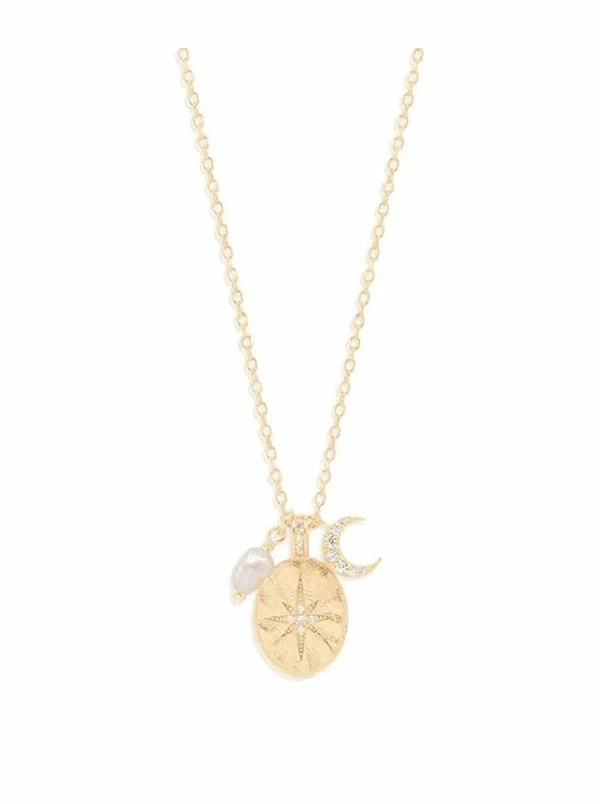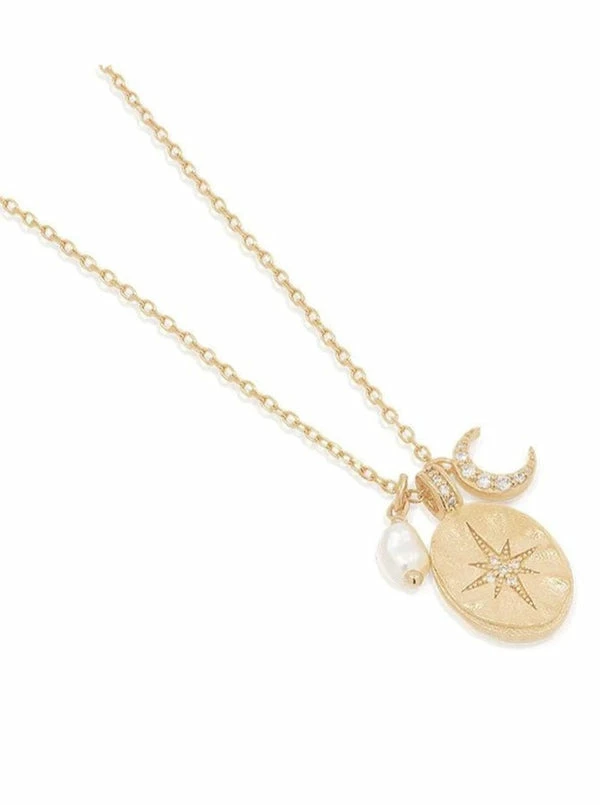 The Dream Weaver Necklace from By Charlotte is a quintessential styling staple. Designed in 18k Gold Vermeil, this delicate necklace features a freshwater pearl, a sparkling crescent moon and a crystal encrusted star pendant that is engraved on the back with "Harness the energy of the universe". With the statement charms and sparkle, this necklace will add an energetic touch whether you layer this piece with the By Charlotte Moonlight Necklace or pair it back on its own. DETAILS & CARE Material: 18kt Gold Vermeil Measurements: 18 inches, adjustable to 16 or 15 inches. Oval pendant: 9mm x 12mmSet with white Cubic Zirconia Crystals Freshwater Pearl Pendant: approximately 3mm x 4mm Moon Pendant: 6 x 6mm – Adjustable chain – Oval pendant set with whit Cubic Zirconia Crystals – Pendant has battered finish on the front and a polished back – Fresh water pearl pendant – Finished with a Pearl detail on the clasp – Each pearl will be unique in size and shape Care Instructions: Pearls are not suitable to be worn in water and should be treated with care. Exposure to water and moisture such as showering, hand washing and swimming can cause jewels to tarnish. Contact with perfume and cosmetic products can damage gold plated and sterling silver jewellery. Keep the anti-tarnishing tabs with jewels to protect against moisture during storage. Only clean your jewels using the By Charlotte polishing cloth provided.