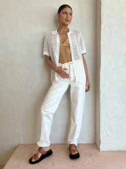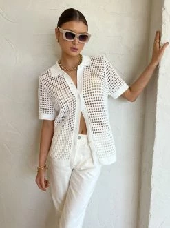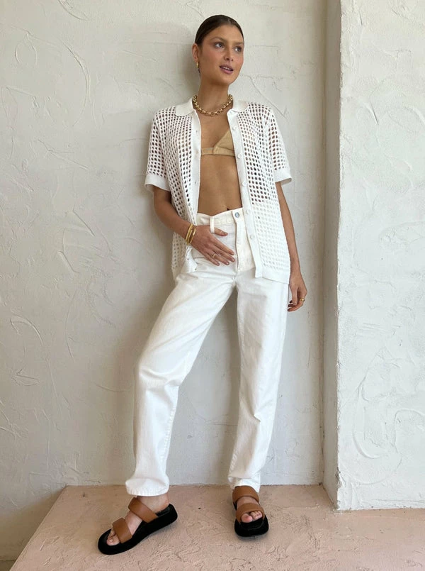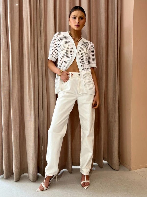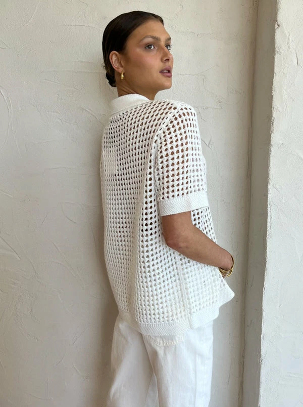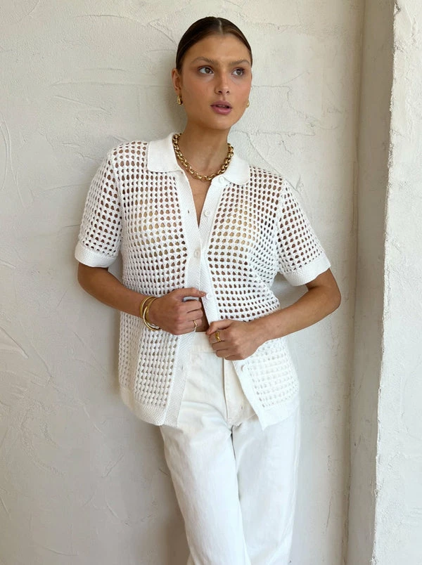 Enhance your Coco wardrobe with intricate textures and indulgent creamy hues with BY JOHNNY'S Picot Knit Shirt in Ivory.Crafted from a soft knit fabrication with large open hole design, this relaxed fit and unisex shirt features a collared neckline and a button through front. You can't help but get carried away to a tropical escapade or to elevate your everyday with this laidback luxe shirt. DETAILS & CARE Fabric: 90% Polyester 7% Elastane 3% Polyamide- Oversized fit- BY JOHNNY logo buttons on centre front- Soft knit fabrication- Collared neckline- Open hole designCare Instructions: Dry Clean Only.Our Coco girl Ella Grace wears a size AU 8 / small.Ella Grace’s height is 178cm. COCO STYLING TIP Complete the look with the Assembly Label Aubrey Knit Skirt in White, Alias Mae Poe Slide in Tan, Porter Tear Drop Earrings in Gold, Porter Pond Ring in Gold, Porter Pond Bangle in Gold, Reliquia Maxima Necklace in Gold, Porter Wave Ring Set in Gold, Porter Chunky Belcher Bracelet in Gold, and the Porter Heirloom Bangle 6mm in Gold.