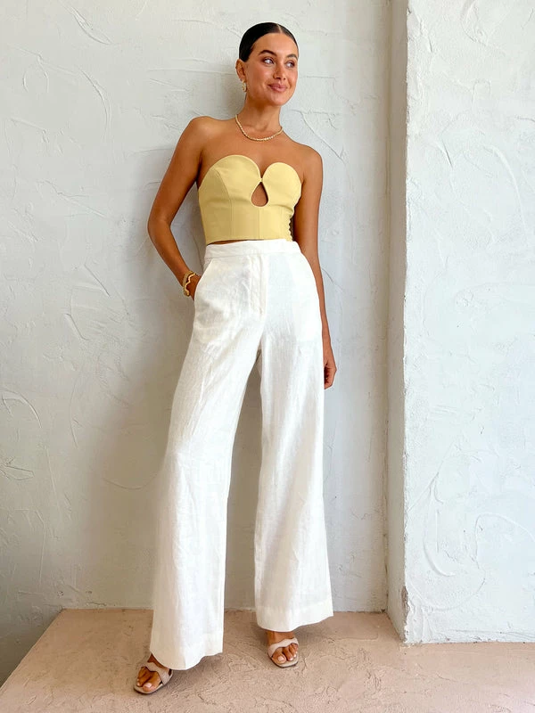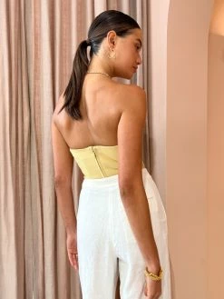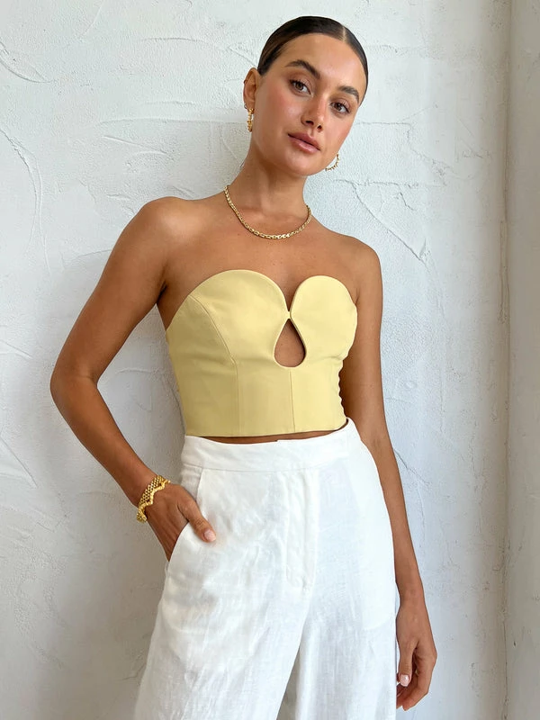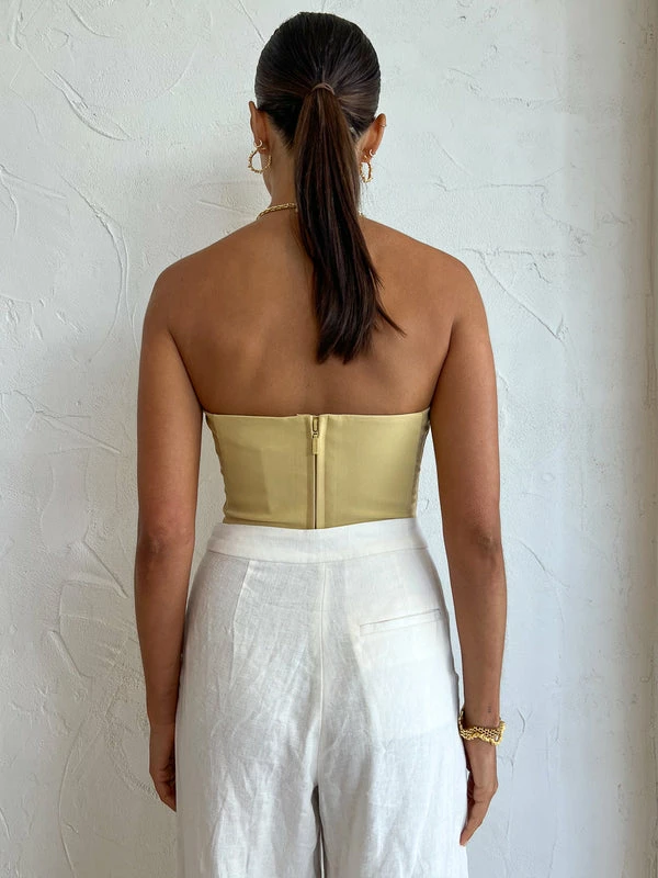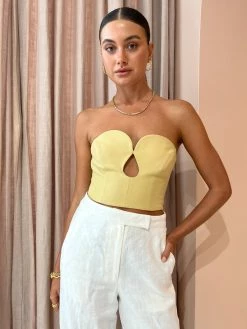 Embrace modern sculptural designs with the Brixton Bodice in Camel by Camilla + Marc. Designed from a polyester blend, this elegantly tailored strapless bodice features a dramatic cut-out feature on the bust that is designed for a close fit with slight stretch. Finished with power mesh panels on the back, Coco girls love this cropped silhouette for pairing with their favourite bottoms on date nights, after-work drinks and birthday celebrations. DETAILS & CARE Fabric: Main 75% Polyester, 20% Viscose Rayon, 5% Elastane Contrast: 92% Nylon, 8% Elastane- Cut out strapless bodice- Designed for a tailored fit with panel line shaping- Cut out detail in front- Structured fit with boning in the side seam- Power mesh panels on the back- Open-ended zipper at back- Fully lined Sizing runs small, we recommend sizing up if you are in-between sizes. Care Instructions: Dry clean only. Our Coco girl Eden wears a size AU 8 / small.Eden's height is 175 cm. COCO STYLING TIP Complete this special occasion look with the Assembly Label Leila Linen Pant in Antique White, Alias Mae Lin Heels in Cream, Raie Bambi Sunglasses in Black, Camilla and Marc Paloma Micro in Black, Amber Sceats Grande Helena Ring in Gold, Arms of Eve Eros Textured Ring in Gold, Amber Sceats Bella Earrings in Gold, Porter Chunky Belcher Bracelet in Gold, Porter Baby Link 2.0 Bracelet in Gold and the Porter Chunky Belcher Necklace 2.0 in Gold.