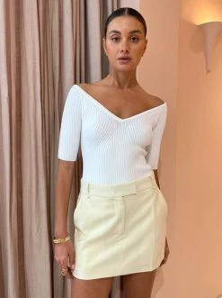 Elevate your wardrobe staples with the Delfina Cold Shoulder Bodysuit in Ivory from CAMILLA AND MARC.Crafted from a stretchy rib knit, this form-fitting bodysuit elegantly sits off the shoulders with the sleeves finishing just above the elbows. Coco Girls love this versatile bodysuit for it's effortlessly flattering silhouette to take them from desk to dusk and through event season with ease. DETAILS & CARE Fabric: 61% Recycled Viscose Rayon, 33% Nylon and 6% Elastane – Knit bodysuit- Off shoulder shaped neckline – Elbow length slim fit sleeves- Snap fastening at the crotch- Bust shapingCare Instructions: Cold gentle hand wash separately.Our Coco girl Eden wears a size AU 8 / small.Eden’s height is 175 cm. COCO STYLING TIP Workwear to weekend, find effortless elegance in the Delfina Cold shoulder, styled with the CAMILLA AND MARC Santiago Blazer and matching Santiago Skirt in Lemon. Complete with the Alias Mae Ari Heels in Cream, the Reliquia Maxima Necklace and Trending Upwards Earrings in Gold, and you're ready for day to night occasions.