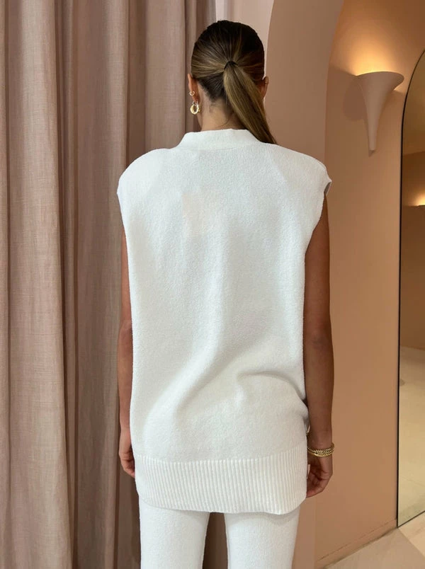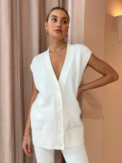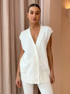 Strike the balance of comfortable and chic with CAMILA AND MARC's Deluca Knit Cardi in White. Crafted from a soft cotton blend knit, this relaxed fit sleeveless knit Cardi features a v neckline, removable shoulder pads and a button through front placket. Detailed with a ribbed hemline, Coco girls adore this Cardi to wear on it's own or layered over your favourite staples for an off duty chic look. DETAILS & CARE Fabric: 70% Cotton, 30% Nylon – Sleeveless cardigan – V neckline – Removable shoulder pads- Button through front placket – Ribbed hemline Our Coco girl Eden wears a size 8 AU / small. Eden’s height is 175cm COCO STYLING TIP For a chic white ensemble complete with the CAMILLA AND MARC Deluca Knit Pants in White, Alias Mae Poe Slides in Tan, Porter Hailey Short Snake Chain in Gold and the Porter Heritage Bracelet in Gold.