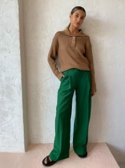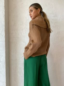 The CAMILLA AND MARC Dena Collared Knit in Tan is an elevated wardrobe staple that amplifies versatility coveted by Coco girls.Crafted from a warming merino viscose blend this heavyweight knit rib adds contemporary lines to a traditional knit silhouette. This jumper features dropped shoulders, elongated sleeves and is heroed by the folded neck cheating an understated roll neck collar with buttoned placket. Designed for a long line relaxed silhouette, this knit will be worn on repeat throughout the cooler months elevating any weekday to weekend look. DETAILS & CARE Fabric: 50% Merino Wool, 32% Viscose and 18% Polyamide – Thick rib knit style – Oversized turn over collar -Drop shoulders- Powder coated matte finish snap buttons on collar placket- Relaxed fit through armhole and body – Fitted long sleeve with self start hemCare Instructions: Gentle cold hand wash, Delicate dry clean in protective bag Our Coco girl Eden wears a size S / 8 AU.Eden's height is 175cm. COCO STYLING TIP For a tonal moment, pair with the Camilla and Marc Viola Pant in Cream, James Smith La Sponda Slides in Chestnut Sherpa and Porter Tear Drop Earrings in Gold. For those day to day errands, pair with the Nobody Kennedy Jeans in Integral, Vieux Versailles in Choc Tort and James Smith La Sponda Slides in Chestnut Sherpa. To add an injection of colour, complete with the Camilla and Marc Riley Pant in Myrtle Green and Twister Flat Sandal in Black.