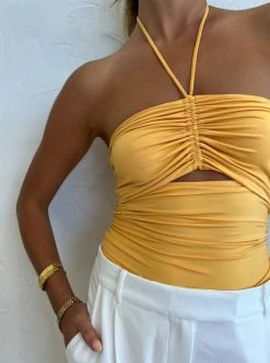Embrace sunshine styling with the Elena Bodysuit in Apricot from CAMILLA AND MARC. Crafted from a polyester fabrication, this fully lined halter neck bodysuit features gathered bust panels with rouleau straps that tie at the back of the neck and soft gathers throughout for a flattering silhouette. Adored for the bold hue, style this versatile bodysuit your way to brighten up any Coco occasion this sunshine season. DETAILS & CARE Fabric: 100% Polyester- Halter neck bodysuit with cut out detail- Gathered bust panels with self rouleau straps that tie at the back of the neck- Designed to be worn fitted- Cut out under bust panels- Gathering at side seams to create soft gathers across body- Snap closure on crotch- G-string fit- Fully lined styleCare Instructions: Delicate dry cleaningOur Coco girl Eden wears a size AU 8 / small.Eden’s height is 175 cm. COCO STYLING TIP Finish the look with the Camilla and Marc Madrid Pant in Ivory, Alias Mae Molly Heel in Cream, Reliquia Over and Over Earrings, Porter Baby Link Bracelet in Gold, Porter Wave Ring Set in Gold, Porter Pond Bangle in Gold, Porter Chunky Belcher Necklace 2.0 in Gold,and the Porter Pond Ring in Gold