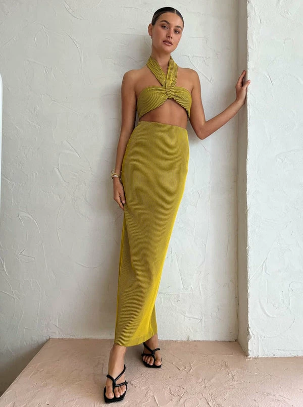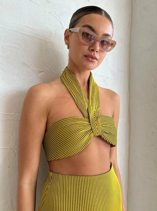 Return to the mediterranean sun with CAMILLA AND MARC's Izaro Bralette in Yellow/Brown.Crafted from a unique fabric striped with gold and brown, this halter neck bralette features a statement twist detailing in the front and gathering at back. This crop top can be worn with your favourite denim for cocktail hour or with the matching skirt for long lunches and summer escapades. DETAIL & CARE Fabric: 100% Polyester- Twist halterneck bralette- Bust is ruched as strap wraps around bust and back around neck- Enclosed gathered elastic at back- Fully lined styleCare Instructions: Gentle cold hand wash separatelyOur Coco girl Eden wears a size AU 8 / small.Eden's height is 175 cm. COCO STYLING TIP For special occasion styling complete the look with the CAMILLA AND MARC Izaro Skirt in Yellow/Brown, Alias Mae Baz Heels in Black, Porter Paris Huggies, Porter Wave Ring Set in Gold, Porter Heirloom Bangle 6mm in Gold, Porter Pond Bangle in Gold, Porter Frill Cuff in Gold and the Porter Pond Ring in Gold.