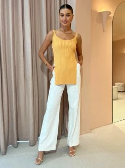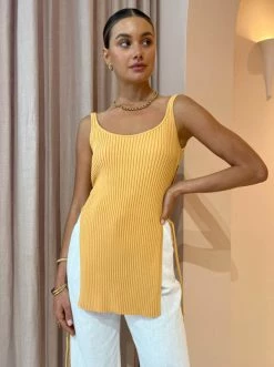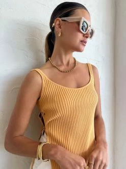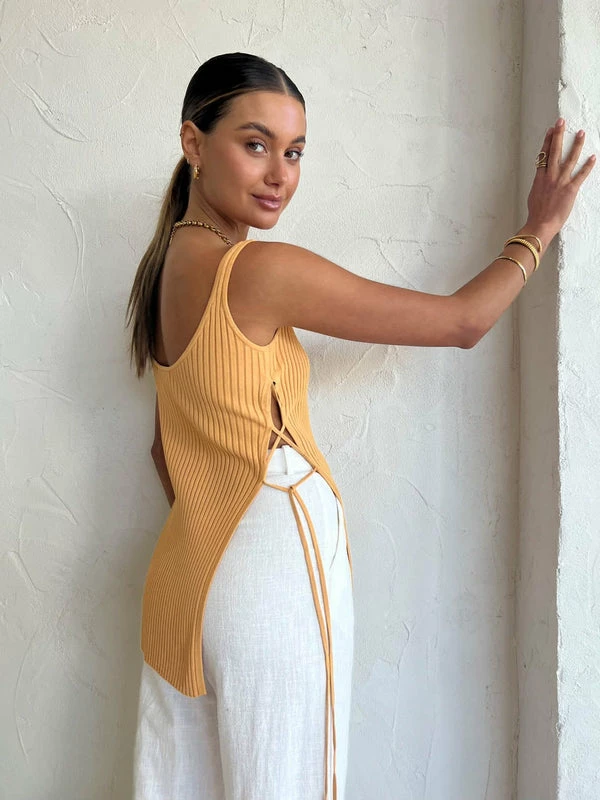 Capture the beauty of warm summer dressing with CLEA's Luca Side Tie Knit in Mango. Delicately crafted in a crepe knit fabrication, this fitted longline knit top with high side splits, features side seam lace detailing with self-knitted ties which can be worn completely closed or slightly looser to suit your occasion.Focus in on your considered wardrobe essentials with this elevated knit top with endless styling possibilities that can take you from dinner dates through to weekend getaways. DETAILS & CARE Fabric: Main: 55% Viscose, 45% Nylon- Knit tank- Fitted style- High side splits that are laced with self-knitted tiesCare Instructions: Cold hand wash, dry cleanableOur Coco girl Eden wears a size AU 8 / small.Eden’s height is 175 cm. COCO STYLING TIP Style with the Bec + Bridge Harriet Pant in Ivory, Alias Mae Zi Heels in Cream, Porter Mali Hoops in Clear, Porter Chunky Belcher Necklace 2.0 in Gold, Porter Wave Ring Set in Gold, Porter Harp Ring in Gold, Porter Pond Bangle in Gold, Porter Frill Cuff in Gold, Porter Heirloom Bangle 6mm in Gold, Vieux Versaille Sunglasses in Bone and the Brie Leon mini Chloe Bag in Natural Stone.