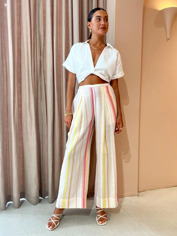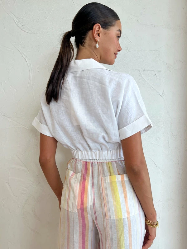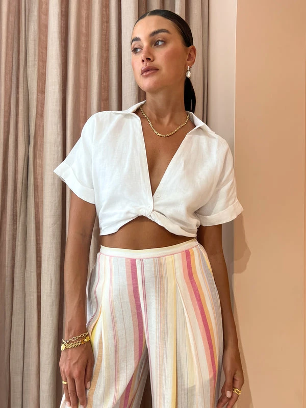 Invest in the perfect mix and match Summer wardrobe with the Beverly Top in White by Elka Collective.Crafted from a linen blend, this top features a cropped sleeve, elasticated waist and deep V neckline that follows into a twist feature at the waist. Playful and versatile, Coco girls love pairing this crop top with denim / shorts for an elevated everyday look or with trousers for cocktail hour. DETAILS & CARE Fabric: 100% Linen- Deep V-neckline with twist detail- Cropped length- Short sleeves with cuffCare Instructions: Cold hand wash with like colours Our Coco girl Eden wears a size AU 8 / small.Eden’s height is 175 cm. COCO STYLING TIP For your next special occasion, complete the look with the Hansen & Gretel Tahiti Pant in Pastel Rainbow, LMS The Violet in White, Arms of Eve Rae Chain Necklace in Gold, Amber Sceats Valletta Earrings in Gold, Porter Baby Link 2.0 Bracelet in Gold, Amber Sceats Coco Bracelet in Gold, Amber Sceats Grande Helena Ring in Gold, Porter Triple Heirloom Ring in Gold, Arms of Eve Eros Textured Ring in Gold and the Brie Leon Mini Camille Bag in White Brushed Recycled Croc.