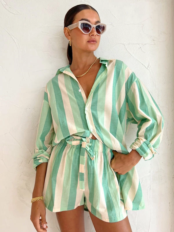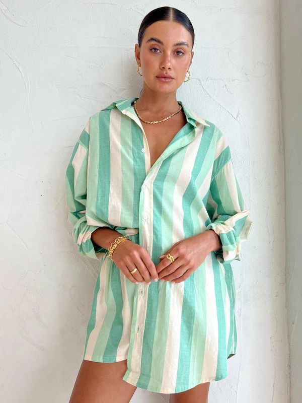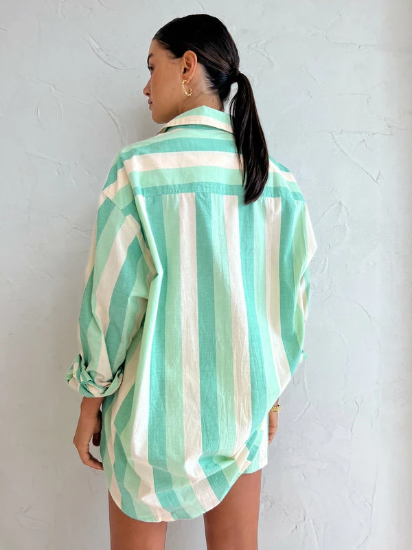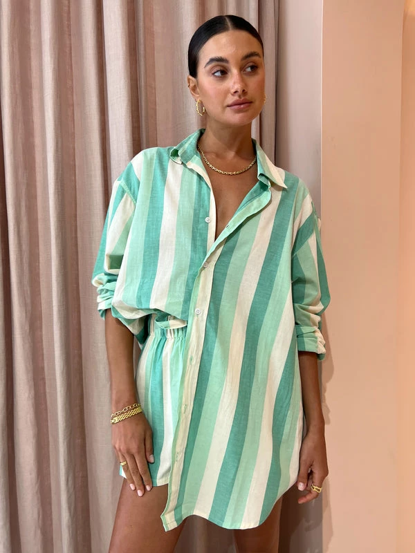 Faithfull The Brand perfect the Summer stripe with the soft and timeless Vega Shirt in Pape Stripe Green. Lightweight and relaxed to wear, this oversized fit shirt is crafted from a soft cotton fabrication. Featuring a collared neckline, cuffed long sleeves and a button front placket. Styled over swim or with the matching Vacances Short in Pape Stripe Green, the Vega Shirt is a must for year round mix-and-match styling. DETAILS & CARE Fabric: 100% Cotton – Longline – Structured collar – Long cuffed sleeves – Button front placket – Oversized fit – Dropped shoulder Care Instructions: Cold delicate hand-wash. Our Coco Girl Eden wears a Size AU 8 / Small Eden's Height is 175cm COCO STYLING TIP Finish the look with the Faithful the Brand Vacances Short in Pape Stripe Green, Vieux Bayonne in Bone, Amber Sceats Bella Earrings in Gold, Porter Chunky Belcher Necklace 2.0 in Gold, Porter Chunky Belcher Bracelet in Gold, Amber Sceats Lane Ring in Gold, Amber Sceats Electra Ring Set in Gold, Porter Pond Ring in Gold, Amber Sceats Helena Bracelet in Gold.