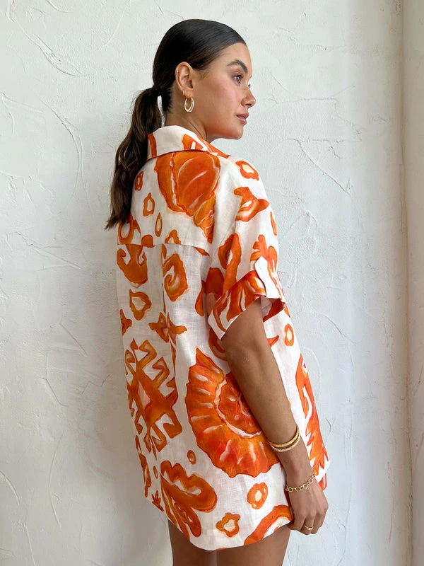 Indulge in earthy abstract hues this summer with the Elis Oversized Tee in Multi by Kate Ford. Designed from a lightweight linen fabrication, this exclusive hand-drawn Tee features shell buttons, pockets and a collared neckline. Adored for its versatility and statement print, pair this tee with the matching Elis Flow Shorts in multi for a statement off-duty look. DETAILS & CARE Fabric: Main: 100% Linen – Oversized Tee- Kate Ford exclusive print- Lightweight linen fabric- Shell buttons- Pockets- Collared neckline- Square silhouette- Cotton voile liningCare instructions: Dry clean only. Our Coco girl Eden wears a size AU 8 / small.Eden’s height is 175cm. COCO STYLING TIP Complete the look with the Kate Ford Elis Flow Shorts in Multi, Porter Triple Heirloom Ring in Gold, Porter Wave Croissant Ring in Gold, Amber Sceats Coco Bracelet in Gold, Reliquia Coralia Hoops in Gold, Reliquia Baby Coralia Hoops in Gold, Porter Belcher Bolt Ring Necklace in Gold and the Alohas Slip On Cross Sandals in Ivory.