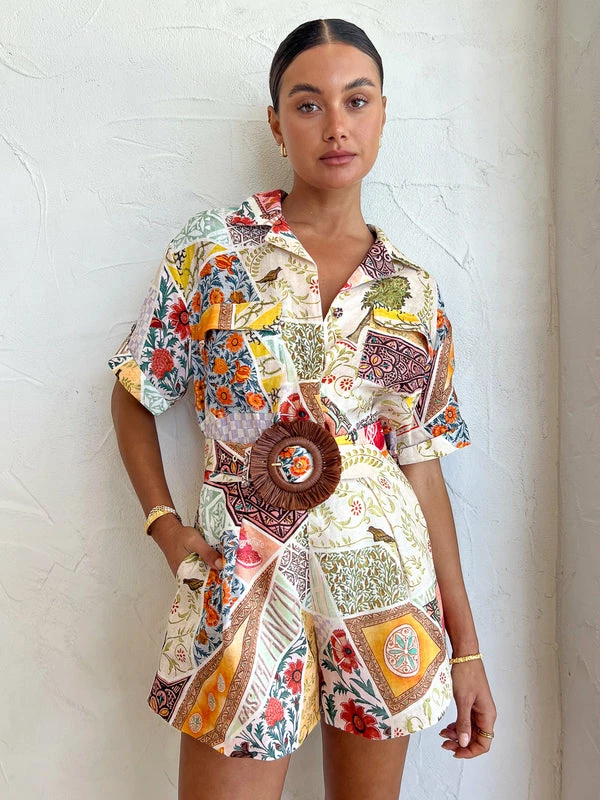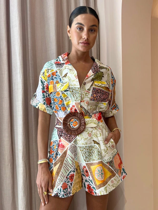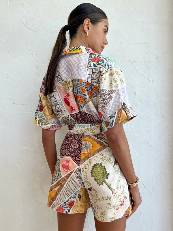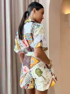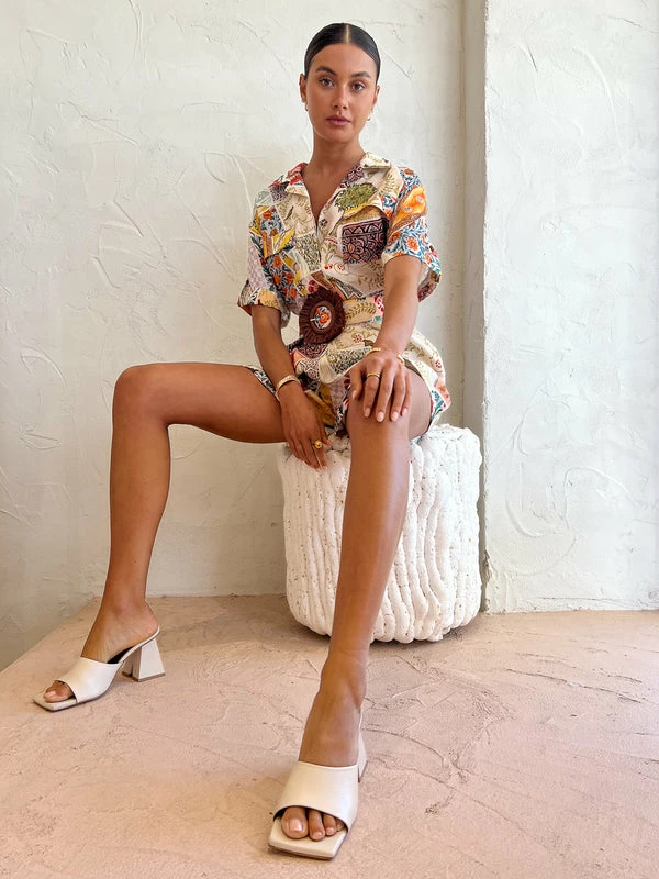 Embrace modern bohemia with the Zellejie Pocket Tee in Multi from Kate Ford. Crafted from a lightweight Linen fabrication, this relaxed shirt features short sleeves with rolled cuffs and functional chest pockets. Designed to be worn on its own or with the matching shorts, this statement top adds a bold print clash to any Coco closet. DETAILS & CARE Fabric: 100% Linen- Oversized sleeves- Folded cuffs- Asymmetrical pockets- Self covered placketPlease Note: All garments are uniquely made, meaning each print placement will look different to the images shown. Our Coco girl Eden wears a size AU 8 / small.Eden’s height is 175cm. COCO STYLING TIP Complete the look with the Alohas Dune Heel in Off White, Arms of Eve Farrah Link Earrings in Gold, Amber Sceats Hunter bracelet in Gold, Porter Wave Ring Set in Gold, Porter Pond Ring in Gold.