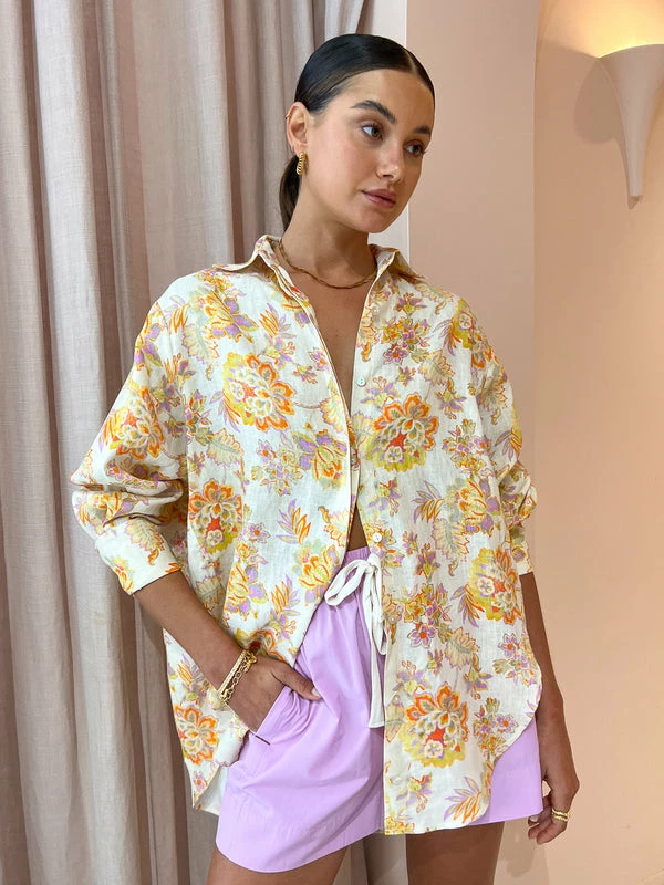 Complete your everyday staples with the Kinney Hampton Shirt in Neon Floral. Crafted from 100% linen, this relaxed long-sleeve top features a curved hemline, a classic button up front and a removable gold hardware belt. Coveted for its versatility and relaxed silhouette, pair the Hampton Top back with the matching Hampton Pants in Neon Floral for a complete elevated off-duty look. DETAILS & CARE Fabric: Main: 100% Linen- Relaxed fit- Curved hemline- Button up long sleeve top- Removable gold hardware beltCare instructions: Cold hand wash separately. Dry cleanable. Our Coco girl Eden wears a size AU 8 / small.Eden’s height is 175cm. COCO STYLING TIP For special occasion styling, complete the look with the Alohas Bellini Heel in Ivory, Amber Sceats Klein Earrings in Gold, By Charlotte Dream Weaver Cuff in Gold, By Charlotte Stardust Cuff in Gold, Arms of Eve Rae Chain Necklace in Gold, Arms of Eve Juliet Pearl Necklace and the Amber Sceats Electra Ring Set in Gold.