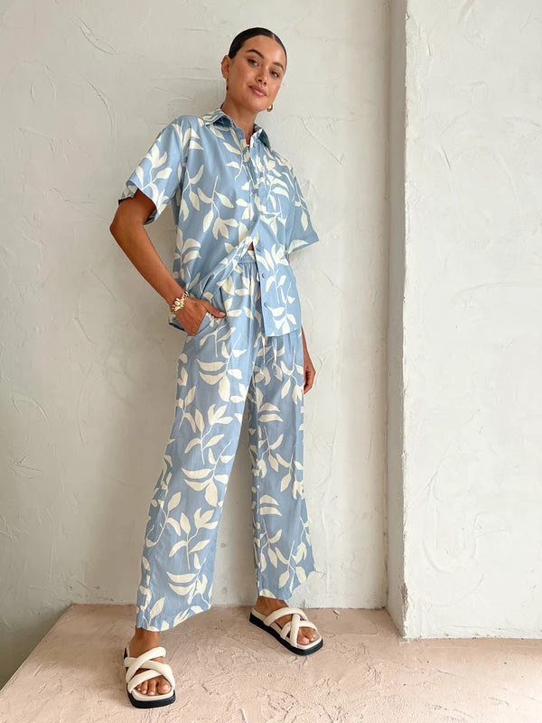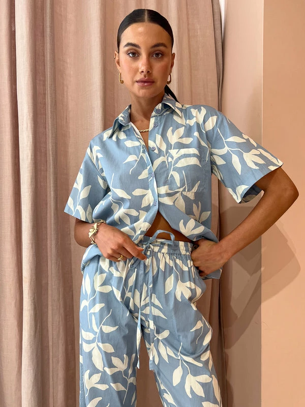 Infuse shoreline-inspired prints into your every day look with the Palm Lounge Shirt Short Sleeve in Eves Leaves by Palm Noosa.Crafted from a soft cotton, this oversized shirt sits relaxed on the body and features a classic collar, short sleeves and a check pocket featureCoveted for its tropical inspired print, pair it with the matching Hallie Pants for an effortless beach to bar look. DETAILS & CARE Fabric: 100% Cotton Poplin- Centre Front Botton Detailing- Point Collar- Check Pocket FeatureCare Instructions: Cold hand wash separately. Do not tumble dry.Our Coco girl Eden wears a size AU 8 / small.Eden’s height is 175 cm. COCO STYLING TIP Complete the set with the Palm Noosa Hallie Pants in Eves Leaves Blue, Alohas Slip on Cross Sandals in Ivory, Arms of Eve Eros Textured Ring in Gold, Alemais Bumble Bee Bracelet in Gold, Reliquia Lucille Earrings in Gold, and the Arms of Eve Rae Chain Necklace in Gold.
