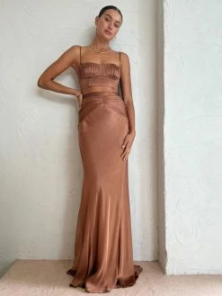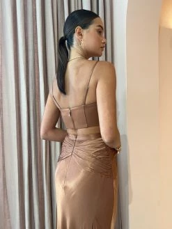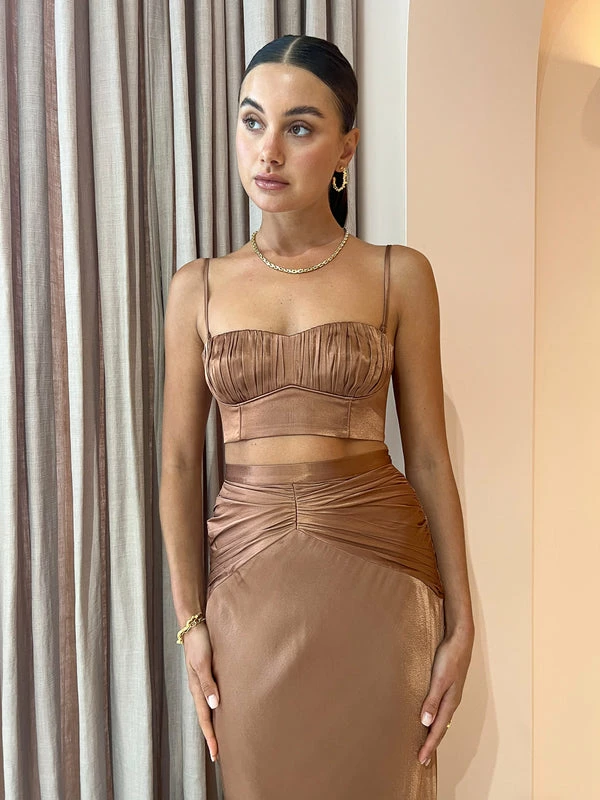 Introducing the elevated separate by Shona Joy with the Ruched Bralette in Almond. Crafted from a silk-to-touch fabrication with a luxurious sheen, this ruched bralette features a sweetheart neckline, removable adjustable rouleau straps and a centre-back zip. Coco girls are adoring this bralette to perfectly compliment their Shona Joy Ruched Maxi Skirt in Almond. DETAILS & CARE Fabric: Main: 58% Lenzing™ Ecovero™ 42% Viscose Lining: Polyester- Silk touch fabric- Luxurious sheen- Sweetheart neckline- Removable adjustable rouleau straps- Ruched corded detail at bust- Centre back zip- Medium weight, non-stretchy wovenCare Instructions: Cold hand washseparatelyyOur Coco girl Eden wears a size AU 8 / small.Eden’s height is 175cm. COCO STYLING TIP Complete the look with the Alias Mae Molly Heel in Cream, , Porter Chunky Belcher Bracelet in gold, Amber Sceats Diana Ring in Gold, Arms of Eve Rae Chain Necklace in Gold, Amber Sceats Lane Ring in Gold, Amber Sceats Bella Earrings in Gold, and the Amber Sceats Helena Bracelet in Gold.