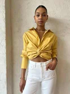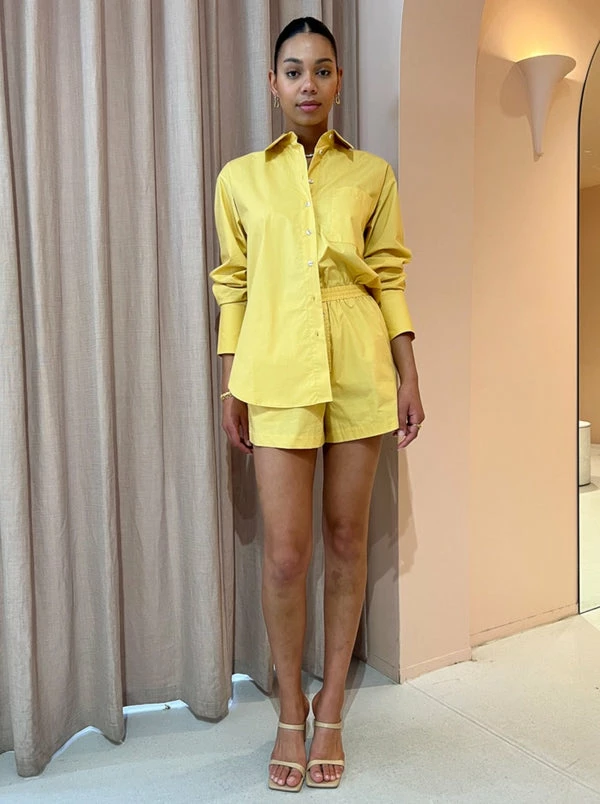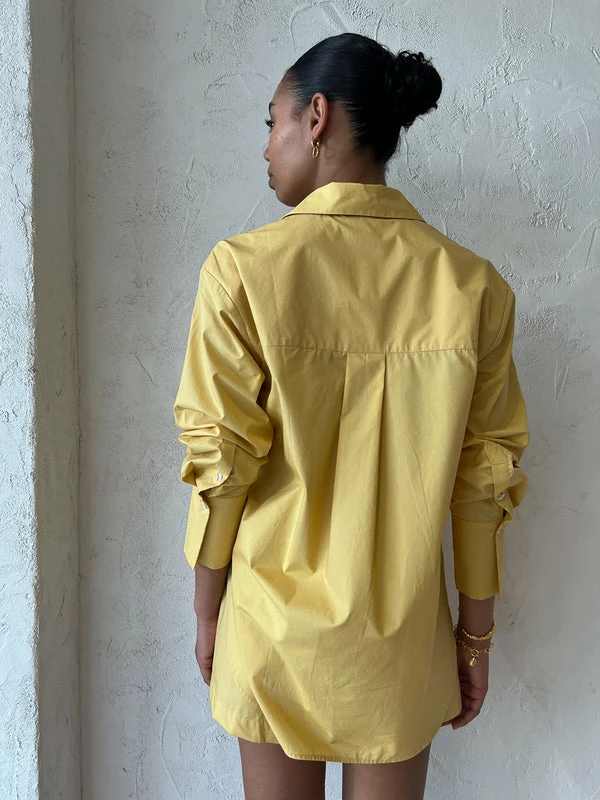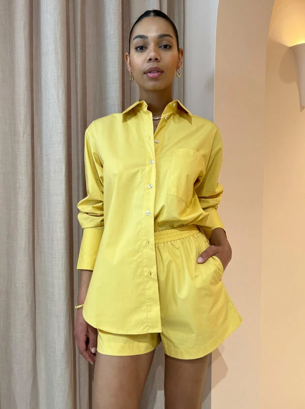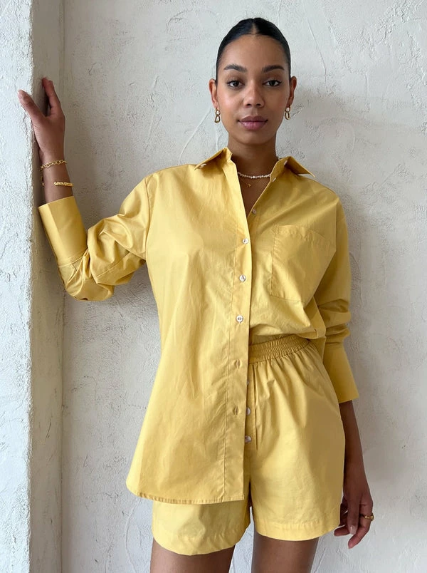 Imbue summers warmth into your weekday to weekend wardrobe with Shona Joy's Isabella Oversized Wide Cuff Shirt in Mimosa. Cut from a crisp cotton fabrication and referencing signature shirt tailoring. This relaxed fit shirt features a structures collar, button down front placket, wide buttoned cuffs and a single chest pocket. Designed to sit oversized on the body, this fun yellow shirt will be worn on repeat for those office days and elevated off duty looks. DETAILS & CARE Fabric: 100% OCS certified organic cotton – Oversized man style shirt- Traditional collar- Front chest patch pocket- Buttoned cuffs- Button down front placketOur Coco girl Eden wears a Size 8 AU / Small.Eden's Height is 175cm. COCO STYLING TIP For signature set styling complete with the matching Shona Joy Isabella Shorts in Mimosa, Alias Mae Cassie Heels in Natural, Porter Pond Earrings in Gold and the Brie Leon Mini Pearl Chocker. For a chic everyday look complete with the Assembly Label Crossover Slides in Biscuit and Ksubi Playback Jeans in Blanc.