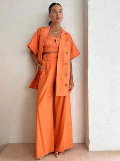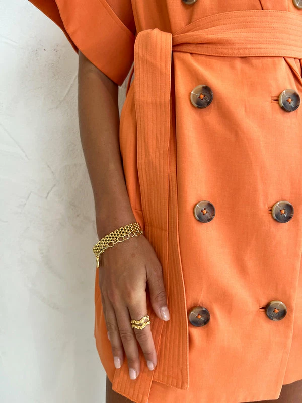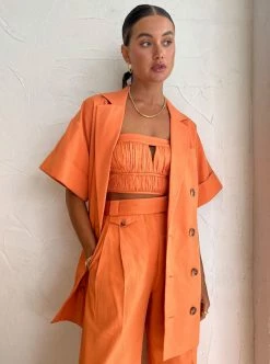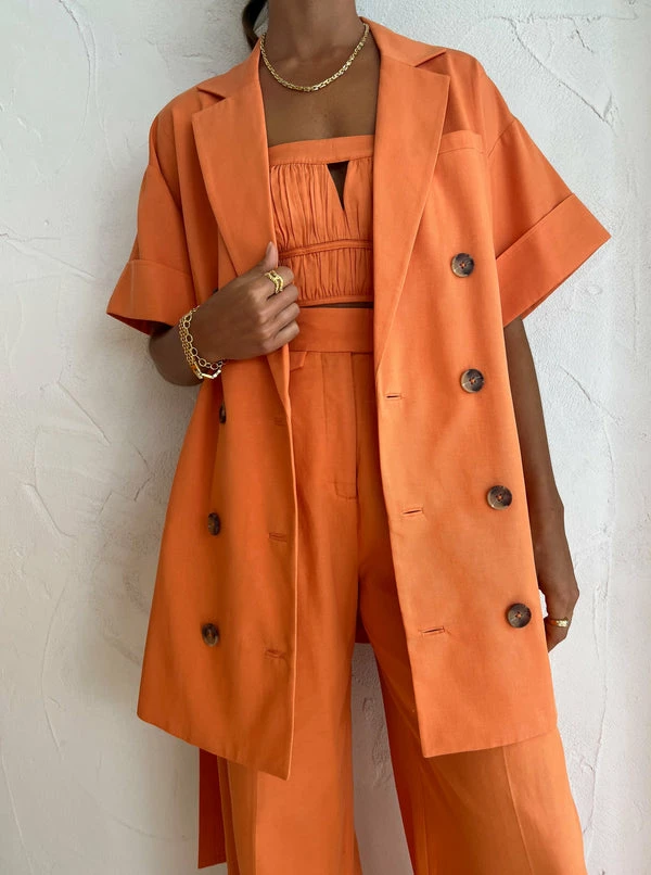 Bring a touch of timeless tailoring to your Summer wardrobe with the Sara Short Sleeve Blazer Dress in Mango by Shona Joy.Crafted from a soft cotton blend, this short sleeve mini dress features double-breasted button closures and a removable self-tie belt. Adored for its versatility and vibrant hue, pair this short sleeve blazer moment with the Sara Bustier and Sara Pant in Mango for a complete co-ord dressing moment that will take you from day to night with ease. DETAILS & CARE Fabric: Main: 66% Tencel Lyocell, 34% CottonLining: 54% Polyester, 46% Viscose- Collared neckline- Pointed lapels- Wide short sleeves- Front breast welt pocket- Double-breasted button closure- Removable self-tie belt- Side pockets- Mini length- Medium weight, non-stretchy wovenCare Instructions: Dry clean only. Our Coco girl Eden wears a size AU 8 / small.Eden’s height is 175cm. COCO STYLING TIP Complete this look with the Shona Joy Sara Bustier in Mango, Shona Joy Sara Pant in Mango, Alias Mae Molly Heel in Cream, Amber Sceats Bella Earrings in Gold, Porter Chunky Belcher Bracelet in Gold, Porter Baby Link 2.0 Bracelet in Gold, Arms of Eve Rae Chain Necklace in Gold, Amber Sceats Diana Ring in Gold and the Amber Sceats Grande Helena Ring in Gold.