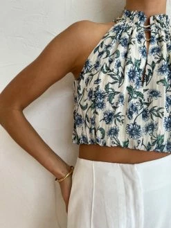 Celebrate beach-to-bar dressing with Significant Other's Isobel Top in Cornflower Daisy. Crafted from 100% Linen, this cropped length top features a high neckline, a fitted elastic waistband, centre front cut-out detail and an adjustable tie at the back of neck.A statement silhouette with a fresh sky blue floral print, Coco girls love this top for summer styling occasions from long lunches, sunset cocktails through to twilight dinner dates. DETAILS & CARE Fabric: Main 100% Cotton- Cropped silhouette- Lined- Sleeveless design- Adjustable neck tie- Elastic waist band- Front cut out detailOur Coco girl Eden wears a size AU 8 / small.Eden’s height is 175 cm. COCO STYLING TIP Complete the look with the Viktoria & Woods Cupid Palazzo Pant in Ivory, Camilla and Marc Vigo Heel in Ivory, Reliquia Telde Earrings in Gold, Reliquia Telde Necklace in Gold, Porter Frill Cuff in Gold, Porter Pond Bangle in Gold, Reliquia Thalia Ring in Pearl/Gold, Porter Wave Ring Set in Gold and the Porter Pond Ring in Gold.