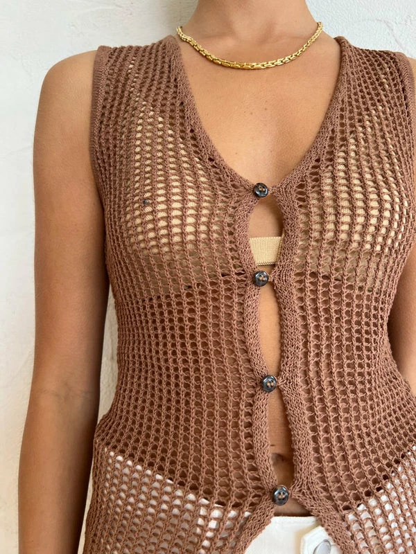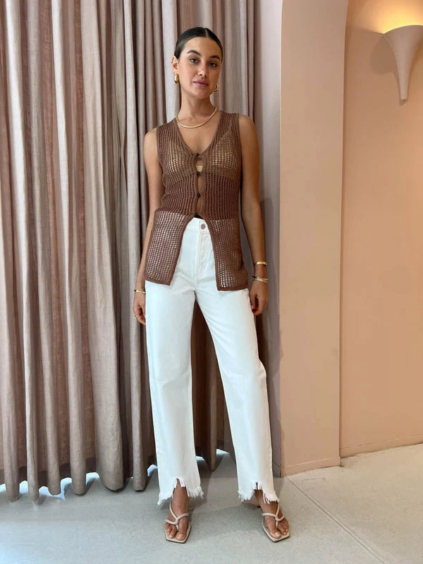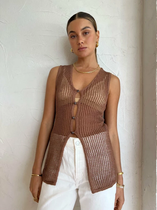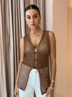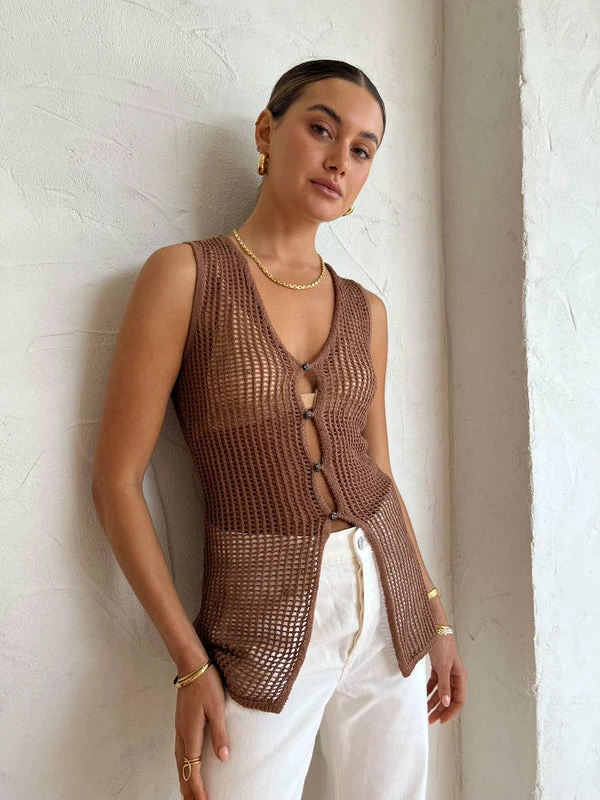 Celebrate timeless summer styling with the SIR. Dulcie Top in Chocolat.Crafted from a semi sheer crochet Cotton blend, this longline button-front sleeveless top features a plunging neckline and a centre front placet. With contemporary crochet detailing and a luxe chocolate hue, this sleeveless shirt is the perfect pairing with the Dulcie Pant in Chocolat for a complete summer look. DETAILS & CARE Main: 52% cotton, 48% Polyester- Button front top- Long silhouette- Sleeveless shirt- Crochet style- Sheer- Plunging neckline – Centre front placketCare Instructions: Dry clean only.Our Coco girl Eden wears a size AU 8 / small.Eden’s height is 175cm. COCO STYLING TIP Complete the set with the Alias Mae Baz Heel in Cream, Arms of Eve Rae Chain Necklace in Gold, Reliquia Trending Upwards Hoops in Gold, Amber Sceats Hunter Bracelet in Gold, Reliquia Thalia Ring in Pearl/Gold, Porter Harp Ring in Gold, Porter Pond Bangle in Gold, Arms of Eve Helios Cuff Bracelet in Gold and the Porter Triple Heirloom Ring in Gold.