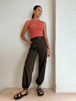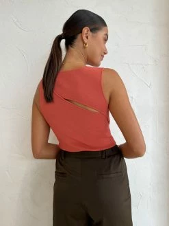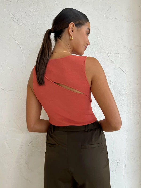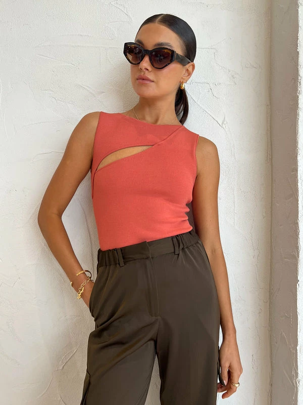 Introduce bright hues of modernity into your Coco staple collection with the Nadja Cut Out Tank in Coral by SIR. Crafted from a slim-fitting knitted fabric that hugs the body, this sleeveless tank features a round neckline and front and back asymmetrical keyhole openings. Adored for its fiery hue, pair this top with denim or trousers to effortlessly elevate your look. DETAILS & CARE Fabric: Main: 80% Viscose 20% Nylon- Front and back asymmetric keyhole openings- Sleeveless – Rounded neckline.- Unlined – A mid-weight compact knit that hugs the body- Generous stretch- True to sizeOur Coco girl Eden wears a size AU 8 / small.Eden’s height is 175 cm. COCO STYLING TIP Style with the Tojha Cami Pant in Fudge, Camilla and Marc Twister Flat, Porter Tear Drop Huggies in Gold, By Charlotte Dream Weaver Cuff in Gold, By Charlotte Stardust Cuff in Gold, Porter Tear Drop Earrings in Gold, Porter Pond Ring in Gold and the Porter Wave Croissant Ring in Gold.
