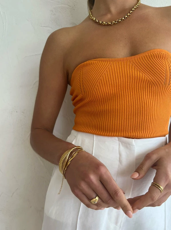 The Sovere Pixie Knit Bodice in Honeycomb is an irresistibly sweet addition to your rib knit repertoire. Designed to contour and flatter, this fitted strapless top is crafted from a high stretch ribbed knit fabrication and features internal grip tape at the front neckline. Rich in colour and texture, the Pixie Bodice is a staple investment for on repeat trans-seasonal styling. DETAILS & CARE Fabric: Main: 49% Viscose 28% Polyester 23% Nylon – Dry knitted rib – Close fitting strapless top – Knitted bust shaping – Internal grip tape at front neckline – High stretch Our Coco girl Eden wears a size 8 AU / small. Eden's height is 175cm. COCO STYLING TIP Complete the look with the Viktoria & Woods Cupid Palazzo Pant in Ivory, Camilla and Marc Vigo Heel in Ivory, Porter Chunky Belcher Necklace in Gold, Porter Heirloom Bangle 6mm in Gold, Porter Wave Ring Set in Gold, Porter Chunky Belcher Bracelet in Gold, Porter Pond Bangle in Gold, Porter Harp Ring in Gold and the Reliquia Over and Over Earrings in Gold.