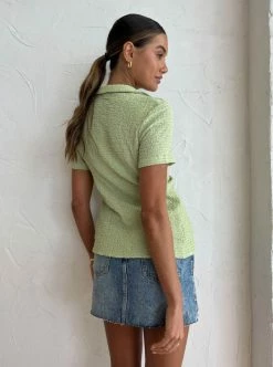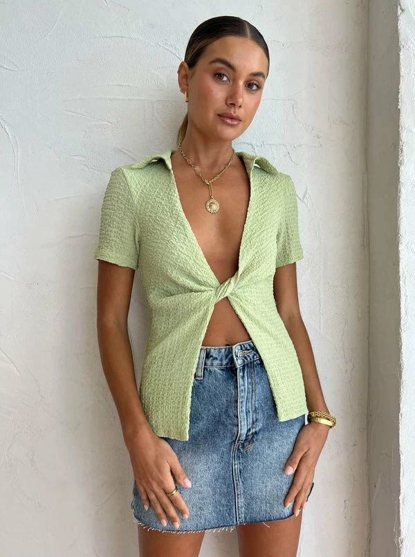 Mix-and-match styling has never looked so good with the arrival of the Waffle Twist Shirt in Mint from Third Form. Designed to be fitted, this stretchy collared shirt is crafted from a Waffle fabrication. Featuring a collared V neckline and knot deail front that exposes the waist. Admired for it's refreshing Mint hue, it's a season-less must for day to night styling. DETAILS & CARE Fabric: 95% Polyester 5% Spandex – Collared – V neckline – Knotted centre – Wrinkle texture – Fitted- Short sleeve – Stretchy Care Instructions: Delicate hand wash. Our Coco girl Eden wears a size AU 8 / small.Eden’s height is 175cm. COCO STYLING TIP Transition from beach to bar with ease, styling the Waffle Twist Shirt in Mint with the Ksubi Model Mini Haven Splits Skirt and add a touch of glamour with the Alias Mae Zi Heel in Cream, the Amber Sceats Hunter Bracelet in Gold, Arms of Eve Helios Cuff Bracelet in Gold, Porter Wave Ring Set in Gold and Reliquia Sevilla Earrings in Gold.