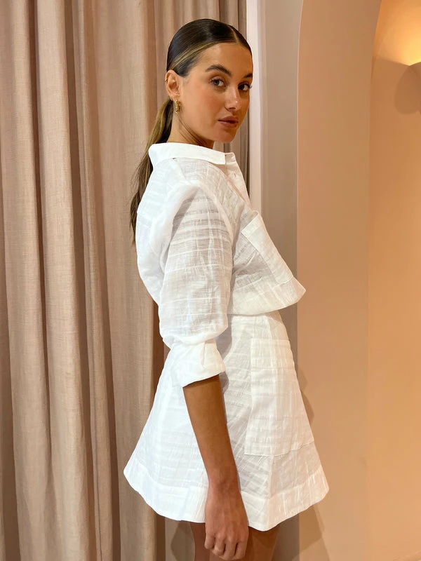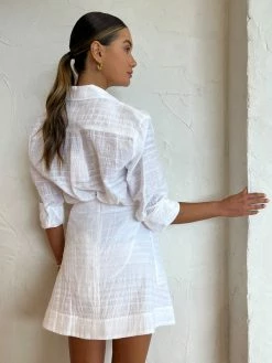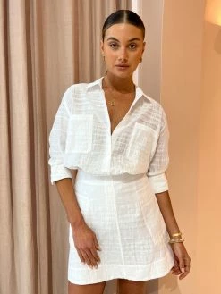 Nourish your neutral shirting with the luxe Evergreen Shirt in White Stripe from Viktoria & Woods. Delicately crafted from a luscious Silk blend, this relaxed tailored shirt fits true to size. Features a collared neckline, sleeve cuffs, chest patch pockets and a button front placket. Finished in a contemporary textured tie dye effect stripe, the Evergreen Shirt will effortlessly elevate your desk to dusk denim styling or compliment the matching Coterie Skirt in White Stripe for cocktail hour. DETAILS & CARE Fabric: 65% Viscose 35% Silk – Semi-sheer – Relaxed fit – Tailored shirt collar and cuff – Button front placket – Chest patch pockets Care Instructions: Dry clean only. COCO STYLING TIP Complete the look with the Viktoria & Woods Coterie Skirt in White Stripe, the Alias Mae Baz Heels in Cream, the Porter Spiral Hoops in Gold, the Porter Pond Bangle in Gold, the Amber Sceats Hunter Bracelet in Gold, the Reliquia Serpa Necklace in Gold/Pearl, the Reliquia Thalia Ring in Pearl/ Gold, the Porter Wave Ring Set in Gold, Porter Pond Ring in Gold and the Arms of Eve Helios Cuff Bracelet in Gold.