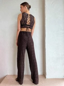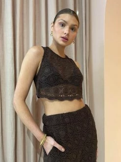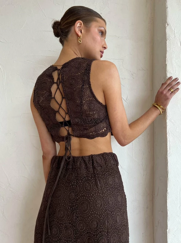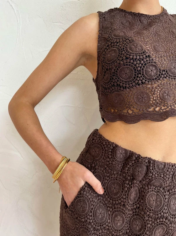 Elevate your resort wear essentials this season with the Mystery Top in Cacao by Viktoria & Woods. Carefully crafted from a semi sheer crotchet fabrication with a delicate lace pattern, this cropped sleeveless style is finished with a tie detailing at the back and scalloped lace at the hem.With the style versatility to be worn back to front, Coco girls love pairing this cropped top with the Salem Trouser for the effortless occasion styling. DETAILS & CARE Fabric: 100% Crotchet Polyester- Crew neckline- Lace fabrication with circular design- Functional centre back tie detail- Can be worn back to front- Scalloped lace hem- Cropped lengthCare Instructions: Hand wash onlyOur Coco girl Ella Grace wears a size AU 8 / small.Ella Grace’s height is 176 cm. COCO STYLING TIP Complete this look with the Viktoria & Woods Salem Trouser in Cacao, Alias Mae Baz Heels in Black, Camilla and Marc Delfina Rib Bralette in Black, Porter Pond Earrings in Gold, Porter Belcher Bolt Ring Bracelet in Gold, Porter Frill Cuff in Gold, Porter Belcher Bolt Ring Necklace in Gold, Porter Wave Croissant Ring in Gold and the Porter Triple Heirloom Ring in Gold.